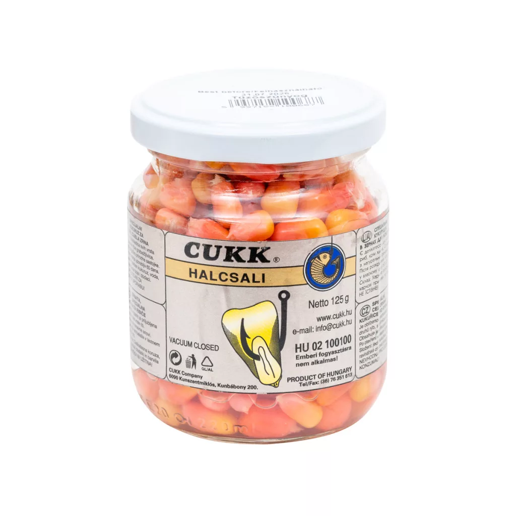 A CUKK szines üveges horgászkukoricák sértetlen, egész kukoricaszemeket tartalmaznak. A szemek keménysége és horogállósága ideális. A méz ízesítés a halak egyik nagy kedvence, legyenek azok keszegfélék, pontyok, amurok. Jó fogási eredmények és rengeteg kapitális példány kifogása fűződik a CUKK ezen termékéhez. Felbontva és gondosan visszazárva még hónapokon át is folyamatosan felhasználhatók a megromlás veszélye nélkül. A CUKK szines üveges horgászkukoricáihoz felhasznált festékanyagok élelmiszerminősítésüek, az egészségre és a környezetre veszélytelenek.