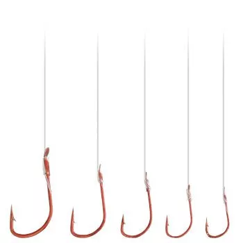 Sok esetben nagy segítséget jelentenek az előkötött horgok, amelyeket a célnak megfelelő horoggal, többféle méretben, a hozzá illő zsinórvastagsággal állítanak össze a gyártók. Ezzel az időt, jó látást és kézügyességet igénylő horogkötés feladatát átvállalják tőlünk. Itt arany, nikkel és piros színű, sode típusú horgokat kötöttek, a horog méretének megfelelő átmérőjű 40cm-es előkezsinórra.